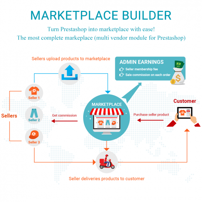 Marketplace Builder is the best PrestaShop marketplace module (multi vendor module) to convert your online store into a marketplace so that multiple sellers can list their products on your marketplace and in exchange you can charge a fixed percentage fee amount for each single order they get or require sellers to pay a membership fee (monthly fee, yearly fee, one-time fee, etc.).